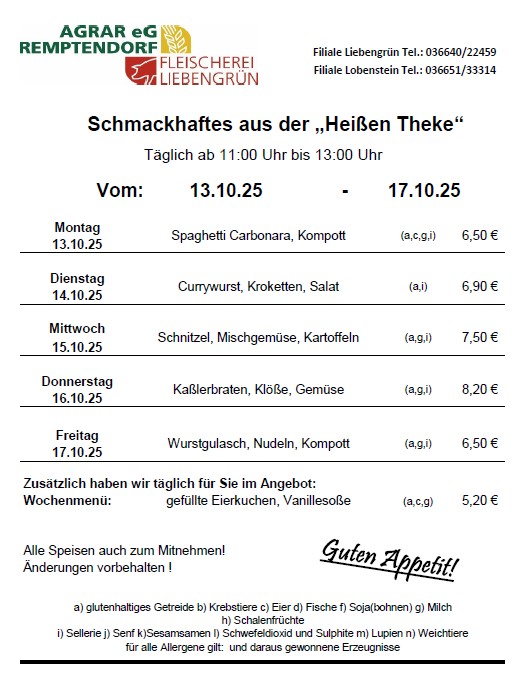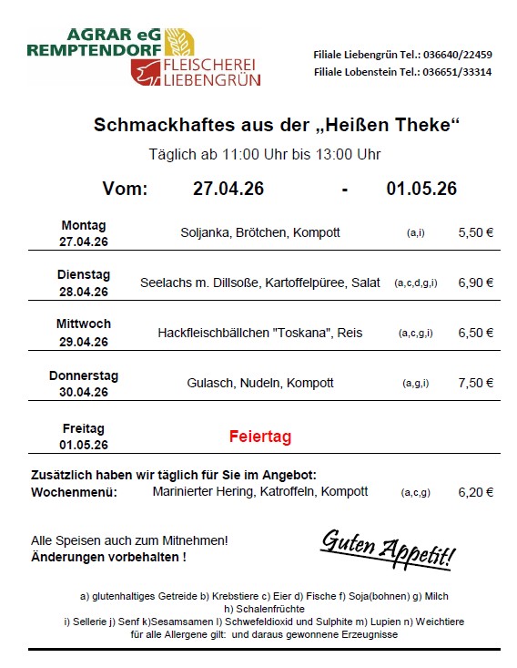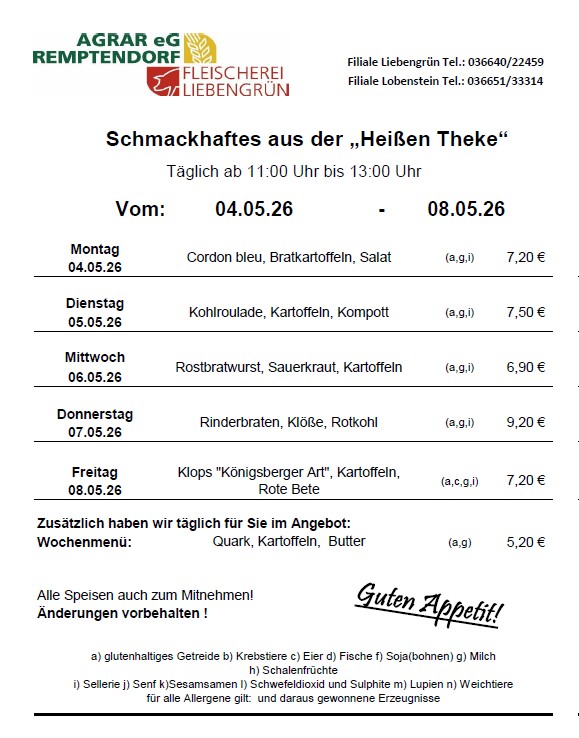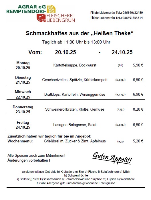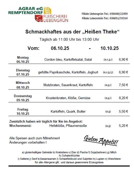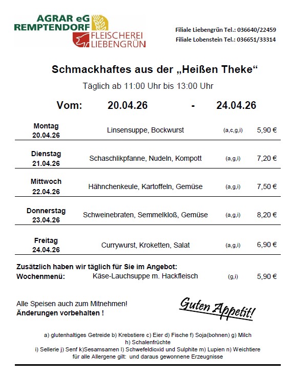 Sie können natürlich Ihr Mittagsmenü auch an der „Heißen Theke“ im Hofladen in Liebengrün und in unseren Filialen in Bad Lobenstein und Gefell genießen.